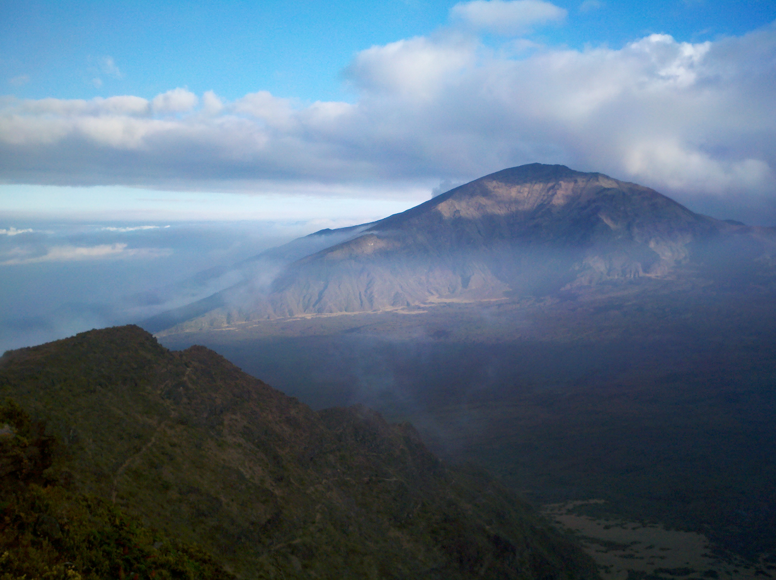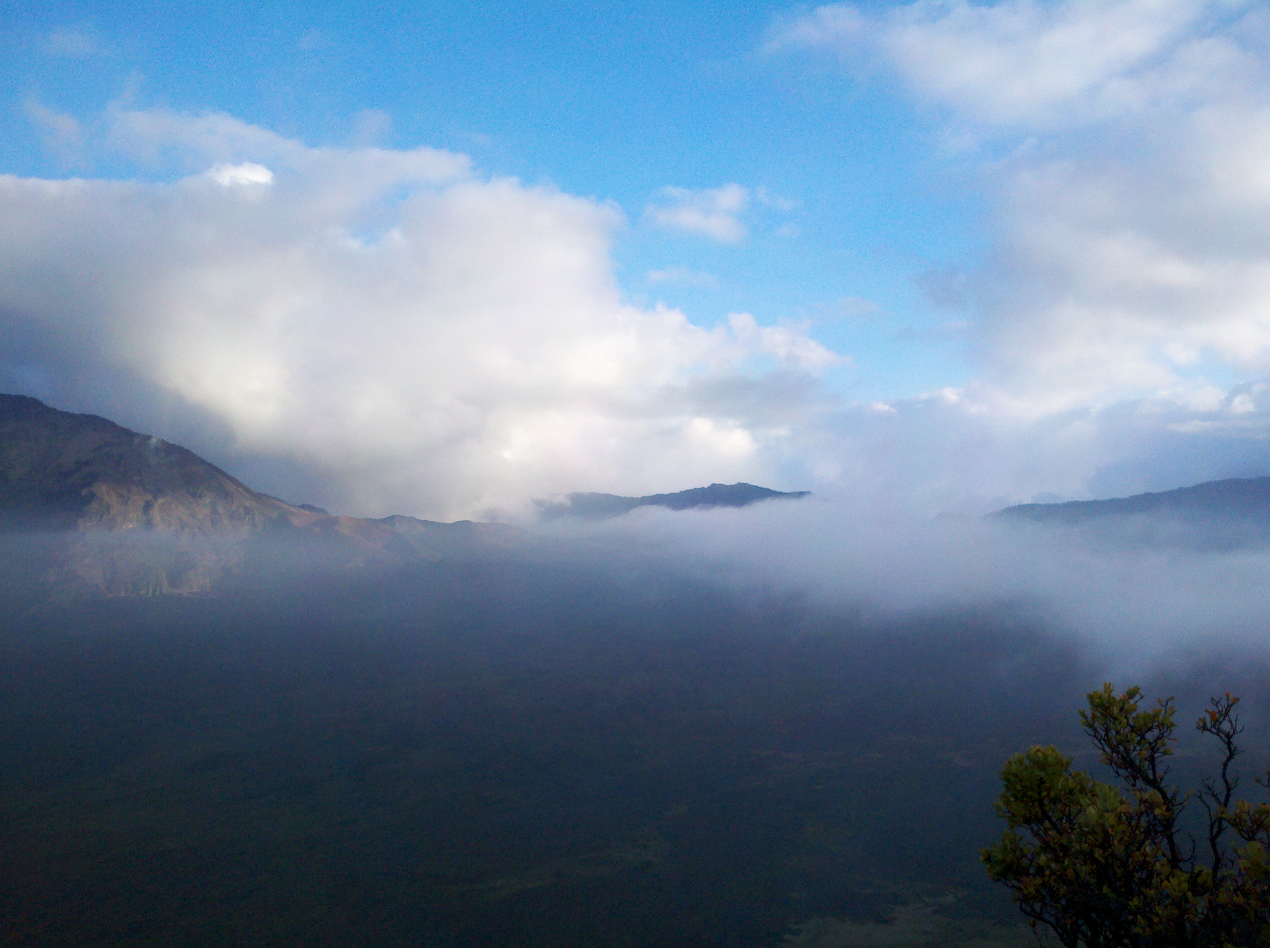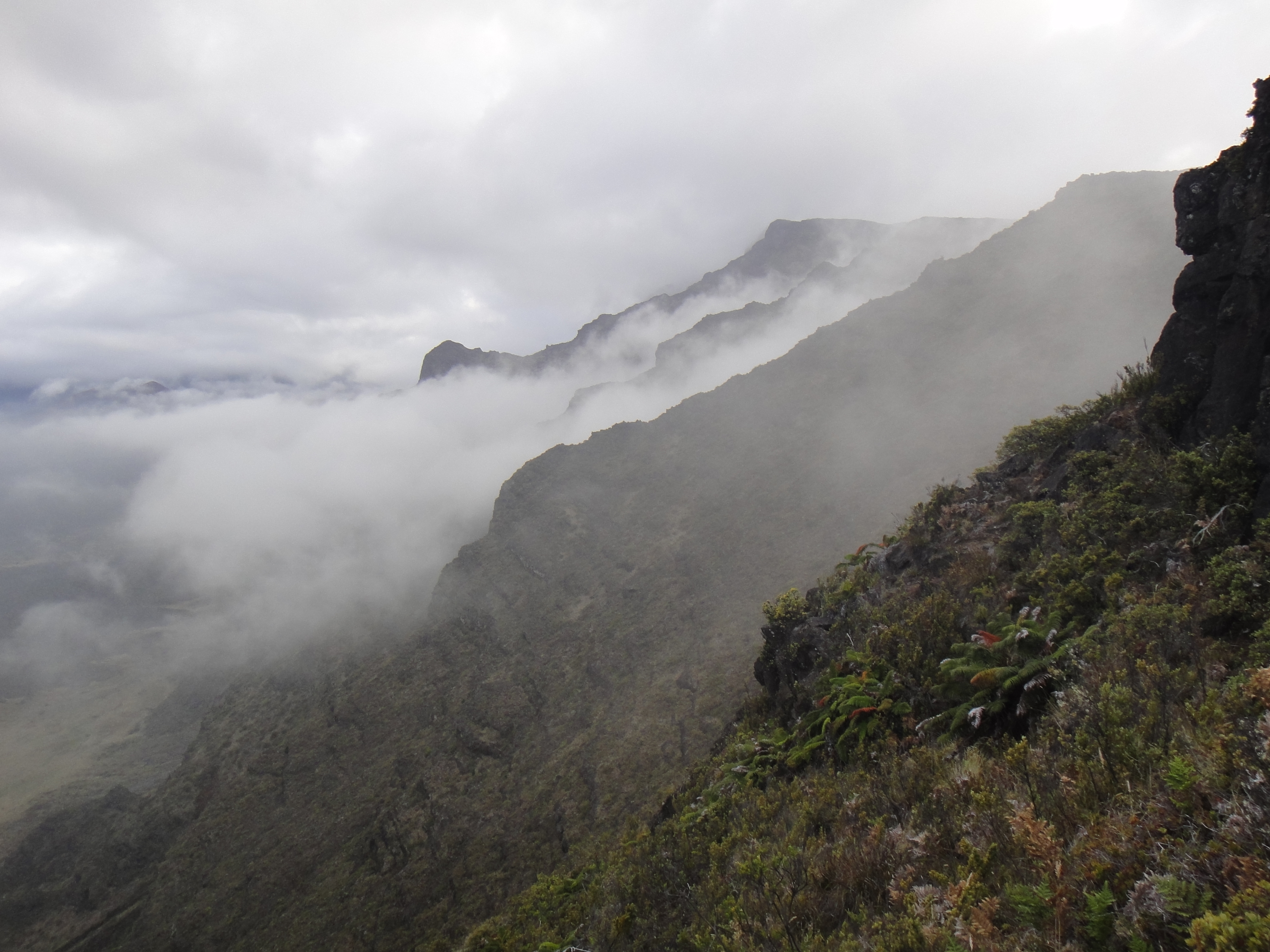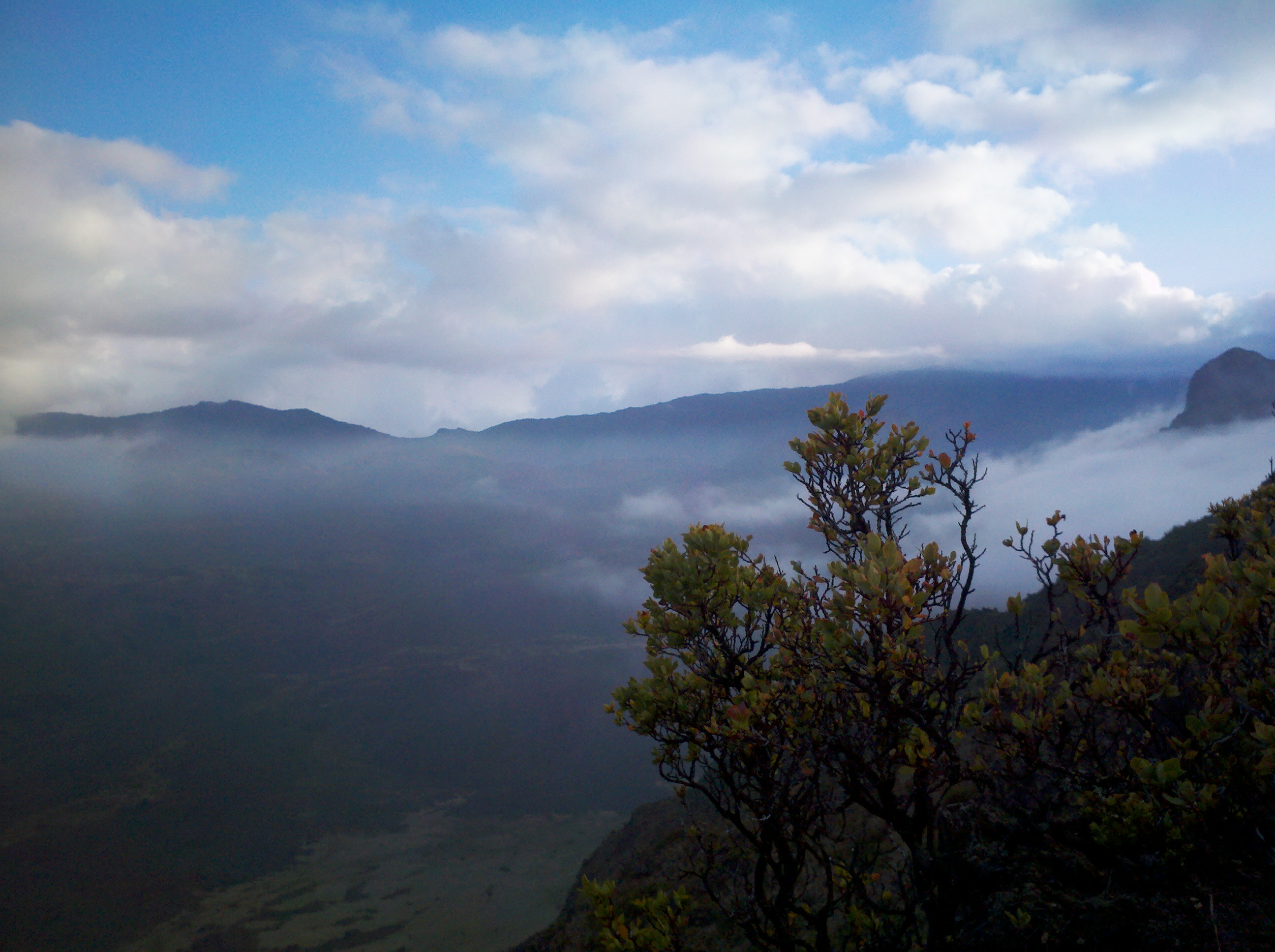 Hiking into the Crater we were enchanted by the floating mist as it rolled over the hills, wrapping itself around bushes, rocks and two young men with a jambox playing “I Shot the Sheriff,” reggae style, that passed us earlier in our hike. They were hiking the whole 27-mile path from one side of the Crater to the other side of the National park on the Hana side of the island.