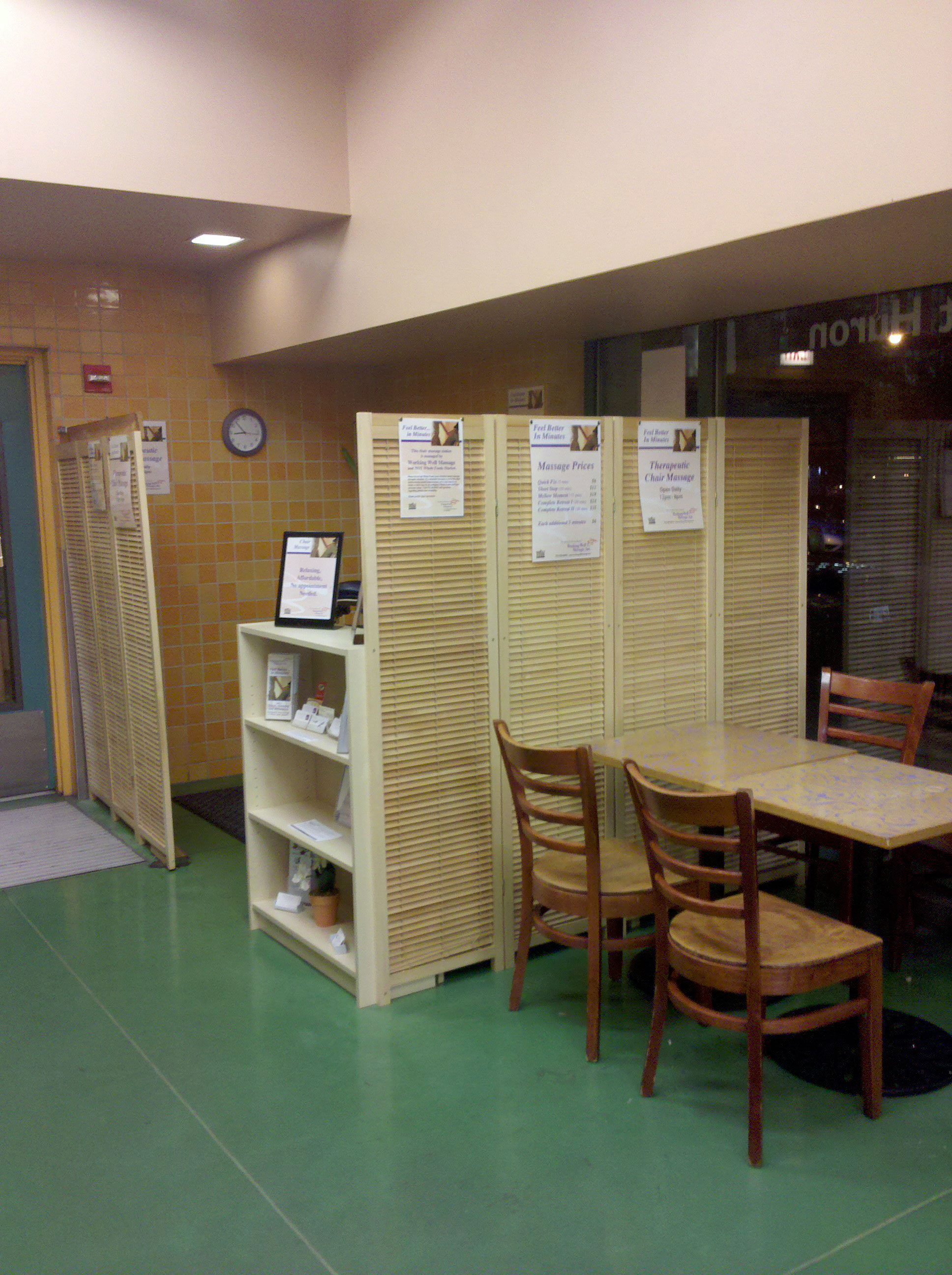 The price for chair massage is very reasonable as well. instead of paying $80 (or MORE) for a massage at a spa where I may or may not get a massage therapist I like, I can get shorter massages, with attention to the areas of my body that need it most (my back, neck and shoulders) for only $24 for 20 minutes. It’s far easier and cheaper for me to get three 20-minute massages than one hour massage on a table. And it costs me at least $10 less ($70 if you did a full hour at WWM versus $80 for a table massage at a spa). Now, I do enjoy table massages. But they take more time because you not only have to factor in the time for making the appointment as well as the actual massage time, but also time for getting disrobed and dressed after the massage, and time to find parking. At Working Well Massage chair stations, we are located inside Whole Foods stores with free parking. So you can get a great 20 minute massage, grab a healthy meal and you are on your way back to the busy-ness of your life.