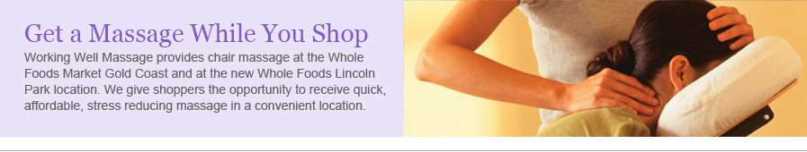 And (shameless plug for self-promotion), feel free to stop by our Working Well Massage chair stations inside the Whole Foods Markets in the Gold Coast (30 W Huron) and Lincoln Park (1550 N Kingsbury) any time from noon to 8pm daily. No appointment needed! Just stop in and in 10 or 15 or 20 minutes we can help you feel less stressed and more relaxed! Click here for our website with more information.