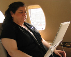 The  picture below shows the Articulating Easel in use on a plane. This is a great pic because it shows how much better you can sit using an iPad holder (although the Portabook could be used much the same way.)