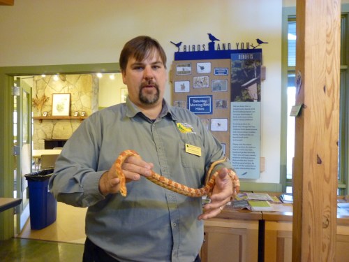 Snakes are one of the many animals kids can meet at the Plum Creek Nature Center. The Guide holds a gentle snake and let me pet it. Kids can too!